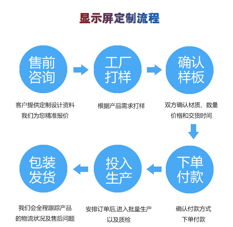 We mainly deal in LCD displays of first-line brands such as Innolux, BOE, Hancai, AU Optronics, LG, Hua Ying and Sharp, providing customers with all-round services. Our main specifications include a full range of LCD products from 4.3 inches to 32 inches, and we can provide various LCD accessory products according to customer needs.