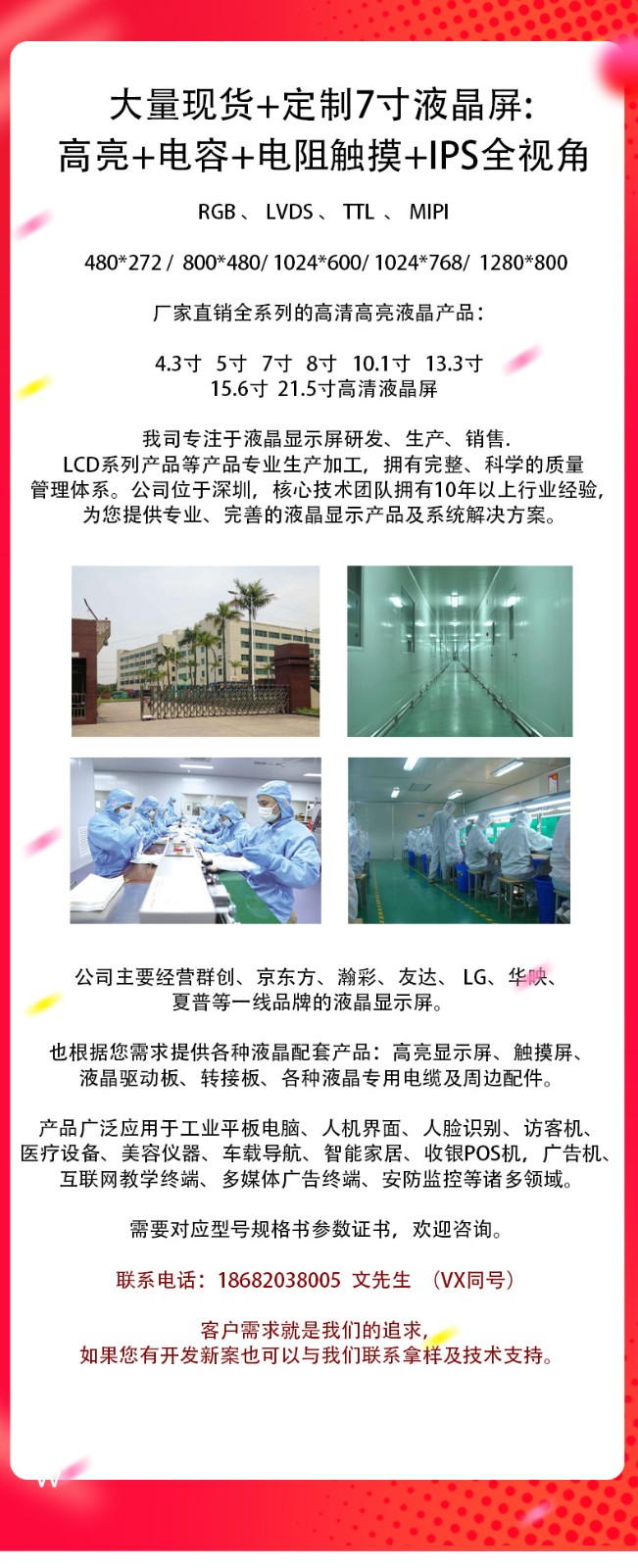 We mainly deal in LCD displays of first-line brands such as Innolux, BOE, Hancai, AU Optronics, LG, Hua Ying and Sharp, providing customers with all-round services. Our main specifications include a full range of LCD products from 4.3 inches to 32 inches, and we can provide various LCD accessory products according to customer needs.